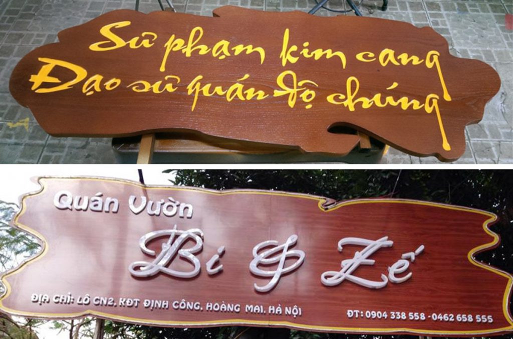 - Bảng quảng cáo bằng gỗ dán chữ nổi mang lại nét độc đáo và giá trị thẩm mỹ rất cao. Các chữ nổi xuất hiện trên bảng gỗ sẽ làm nổi bật lên những thông tin mà cửa hàng hoặc doanh nghiệp muốn truyền tải đến khách hàng. Ngoài ra, bạn có thể kết hợp bảng hiệu bằng gỗ dễ dàng với những vật liệu khác như inox, mica,..